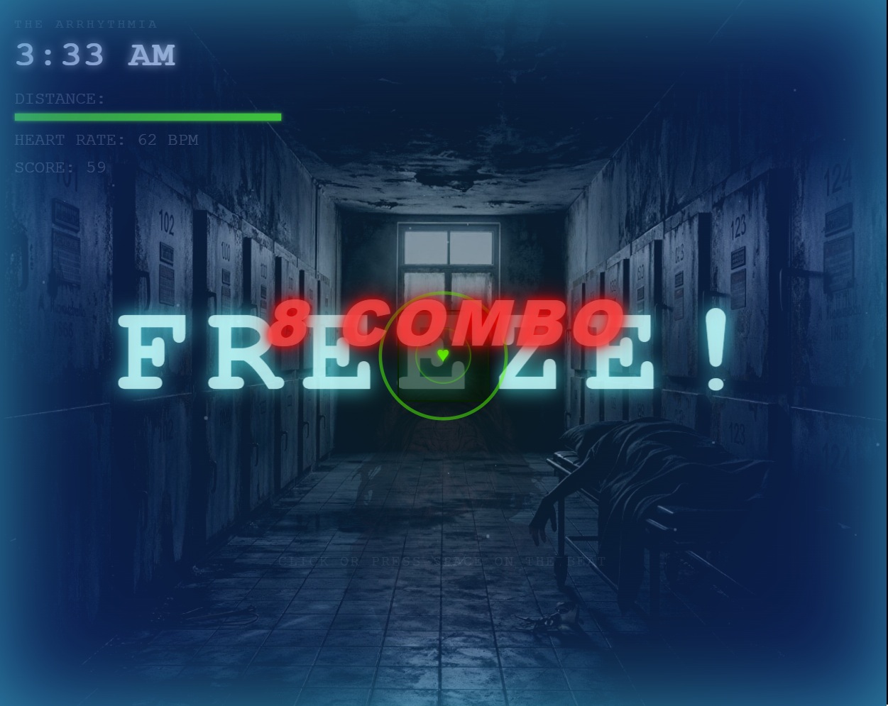 SPACEBARexactamente cuando el anillo rojo se alinee con el anillo objetivo blanco. - 👁️ NO ENTRES EN PÁNICO: La oscuridad intentará engañarte con destellos repentinos, ruido estático y alucinaciones auditivas (Sustos Falsos). Mantén el pulso firme. Si machacas el botón por miedo, tu nivel de estrés se disparará.
