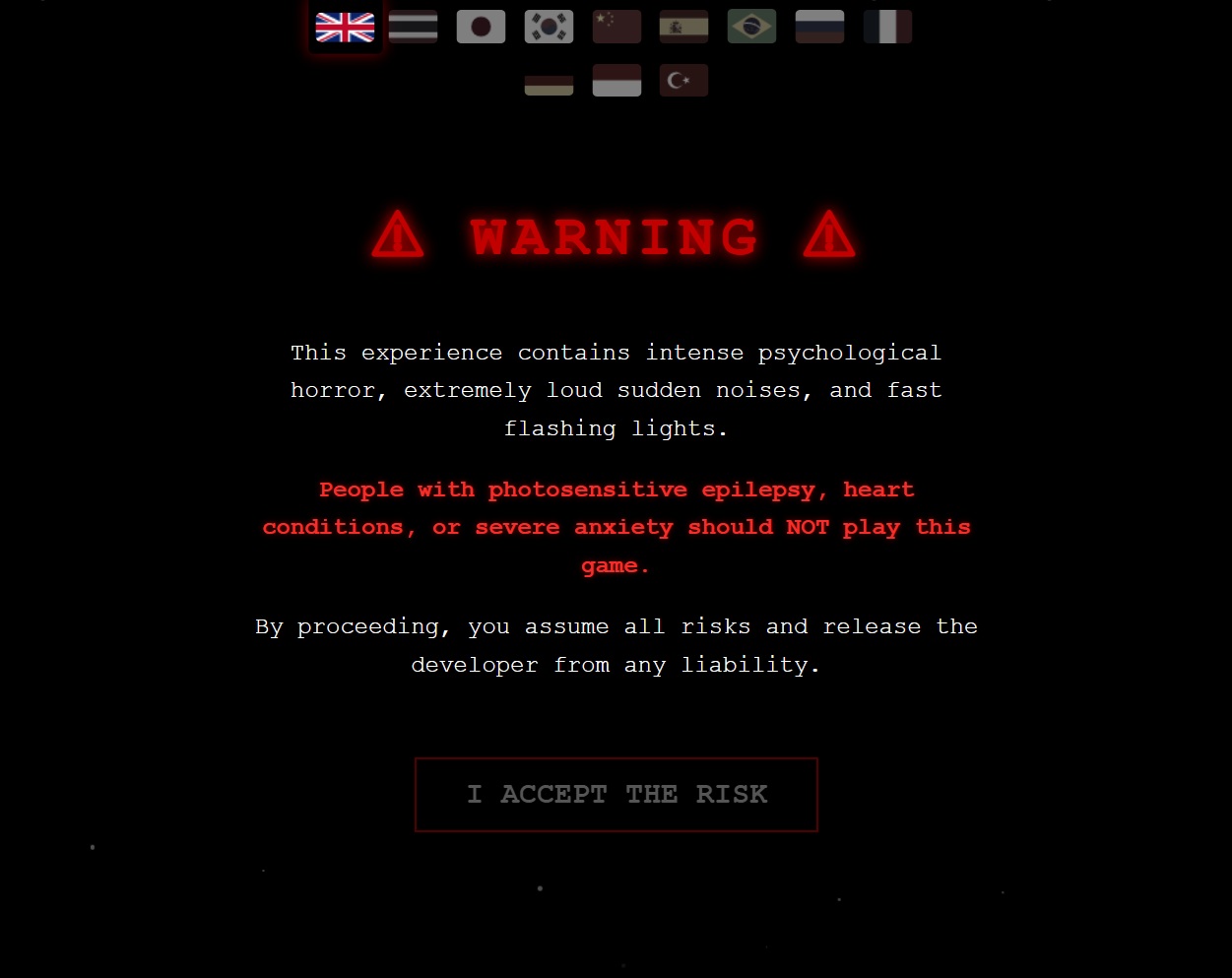 This experience contains intense psychological horror, extremely loud sudden noises, and fast flashing lights. People with photosensitive epilepsy, heart conditions, or severe anxiety should NOT play this game.