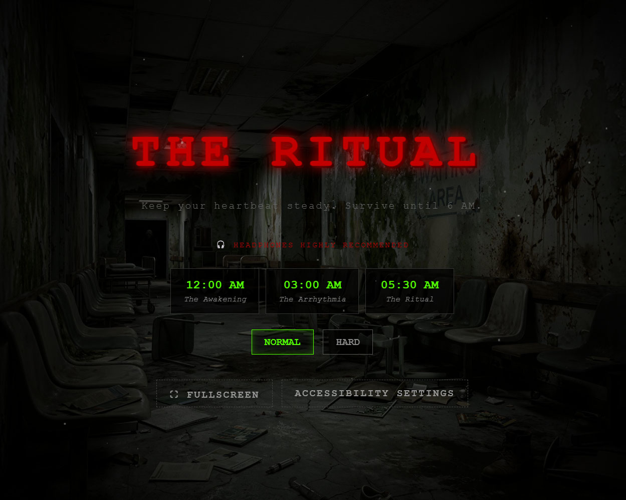 THE RITUAL is a tension-driven, rhythm-based micro-horror experience. To survive, you must maintain your focus and keep your heart beating at a perfectly steady pace. If you panic, if you lose the rhythm, or if you fall for the shadows' tricks... your heart will stop.